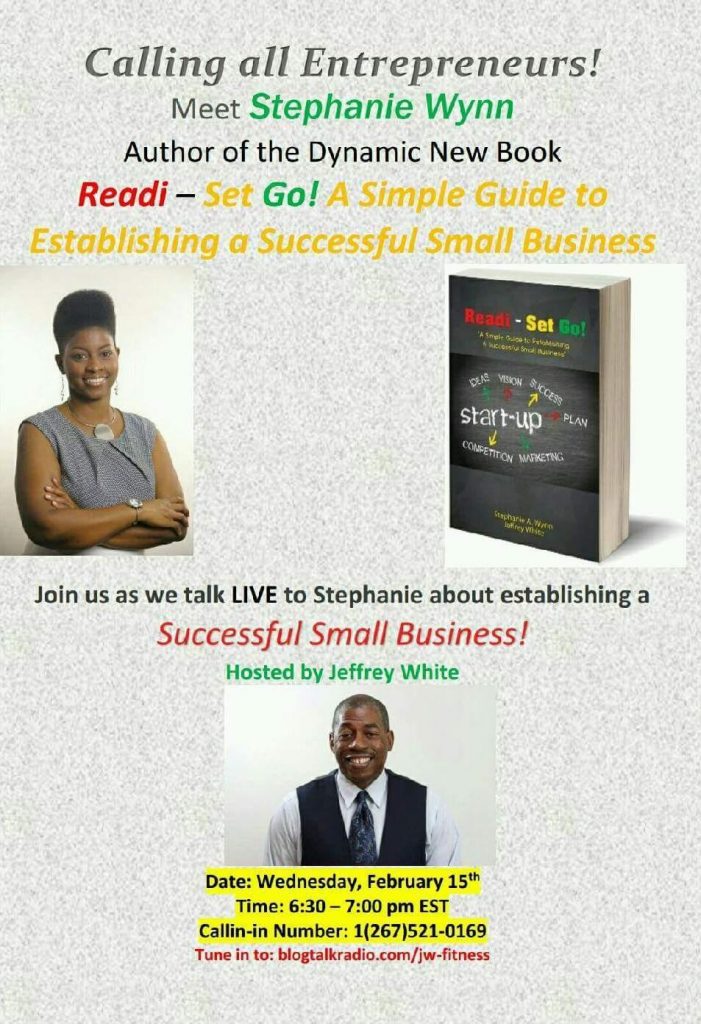 10 Feb Calling All Entrepreneurs (Wednesday, February 15) at 6:30pm Posted at 15:09h in Community Events by Stephanie wynn 0 Comments 0 Likes http://www.blogtalkradio.com/jw-fitness/2017/02/15/calling-all-aspiring-entrepreneurs-meet-author-stephanie-wynn